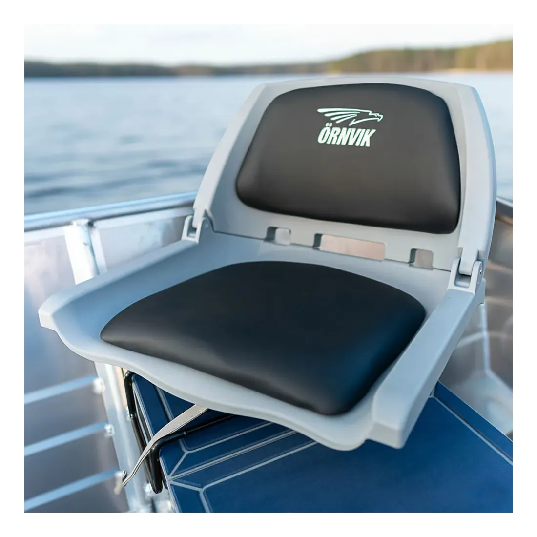 Vikbar och vadderad stol med justerbart underrede från Örnvik. Går att vika och låsas när båten transporteras eller inte används. Kan vridas 360 grader.