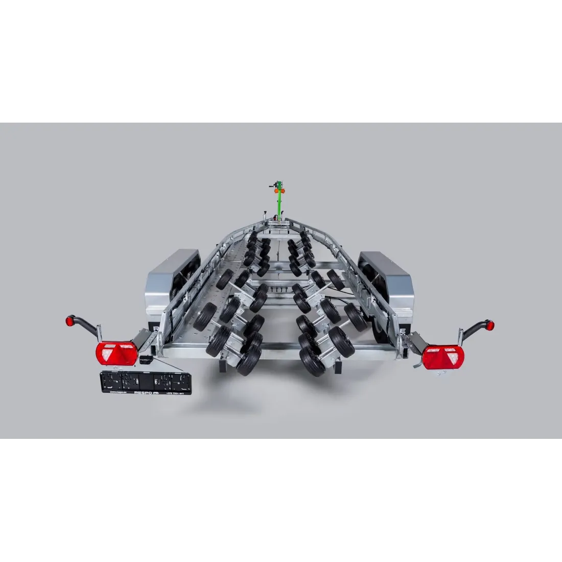 Genomgående stark men lättviktsram och självjusterande multirulle stödsystem gör vår MR-serien ett perfekt val för standardskrov samt speciellt formade skrovar. Utmärkande egenskaper är flyttbar axel, komplett set LED lampor, vår signummärkta baklampshållare, säkerhetskedja och 32+4 kraftiga sidorullar. Dessa och mycket mer gör trailer till en verkligen professionell båttrailer.