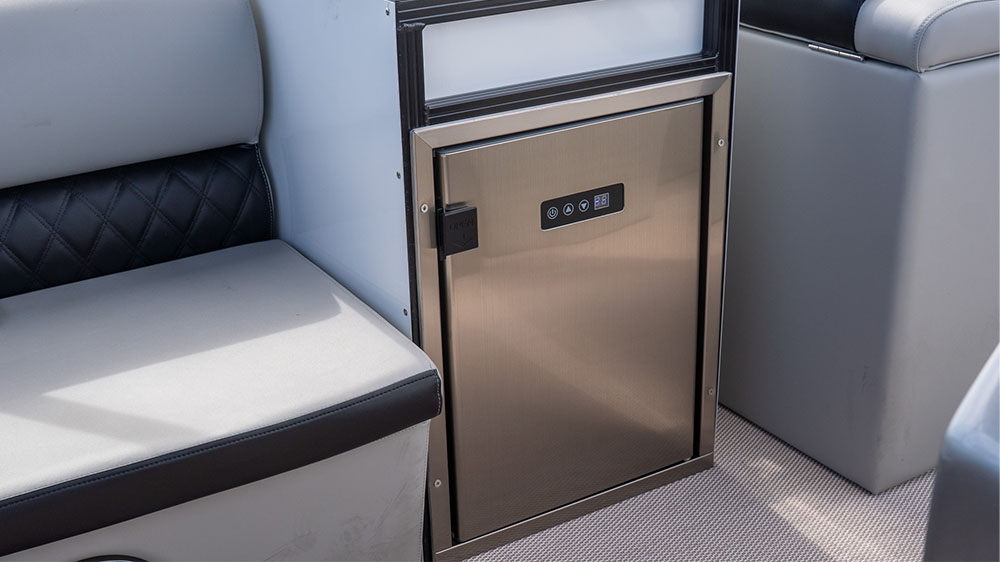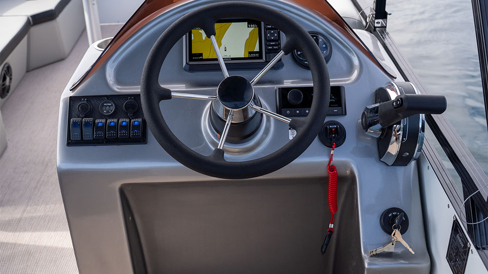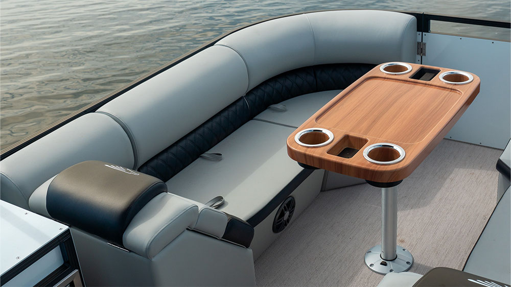 Rattkonsol med vindskyddande ruta, Stor främre lounge med flyttbart bord samt mugghållare, massvis med öppningsbara stuvutrymmen runt om i hela båten, Stor L-soffa aktertill med mugghållare, fällbar och avtagbar biminitop, rejäl badstege, Kylskåp 50L