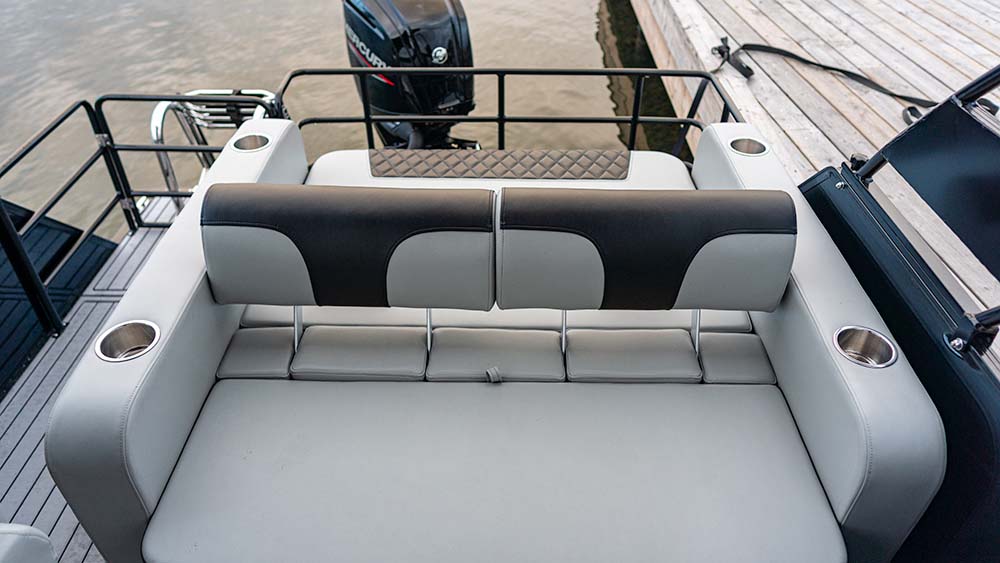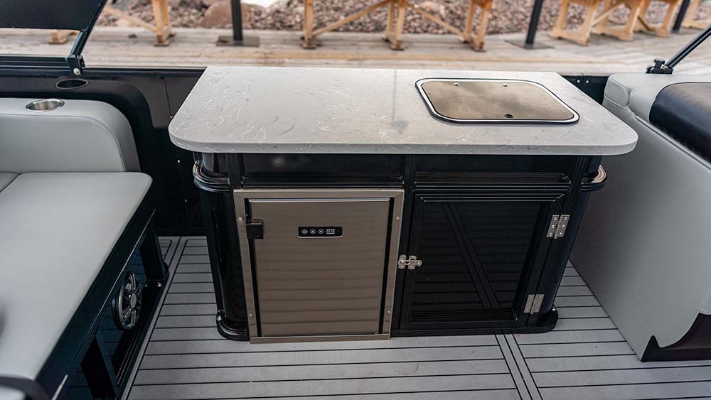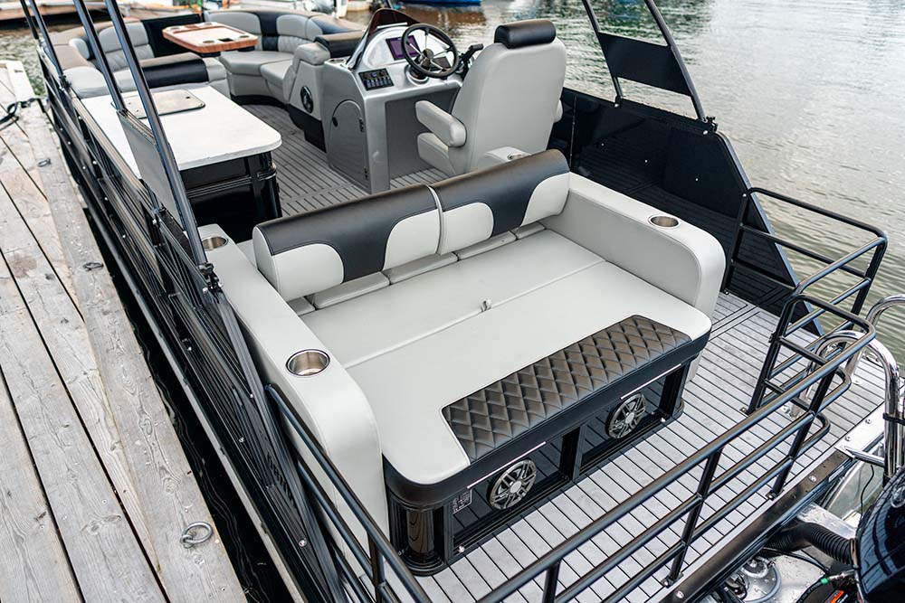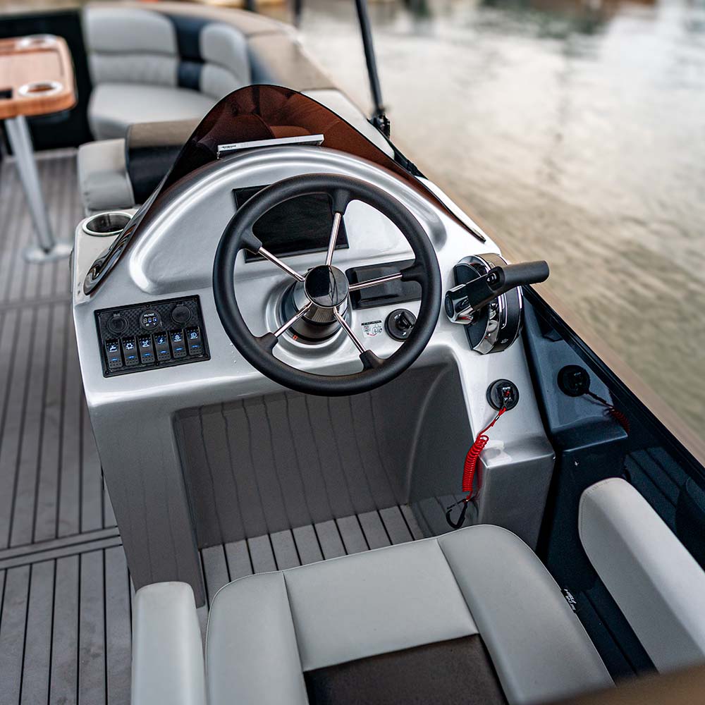 Rattkonsol med vindskyddande ruta, stor främre lounge med flyttbart bord samt mugghållare, massvis med öppningsbara stuvutrymmen runt om i hela båten, Stor solbädd med flip-ryggstöd, fällbar och avtagbar heltäckande biminitop, rejäl badstege, Kylskåp 50L